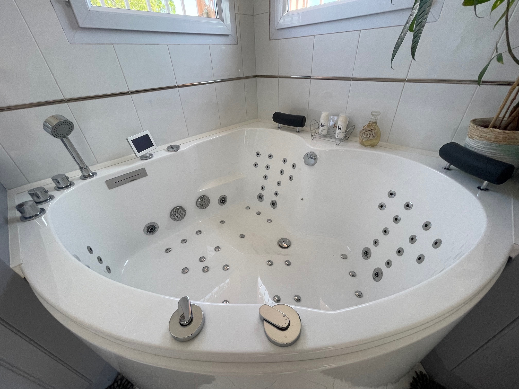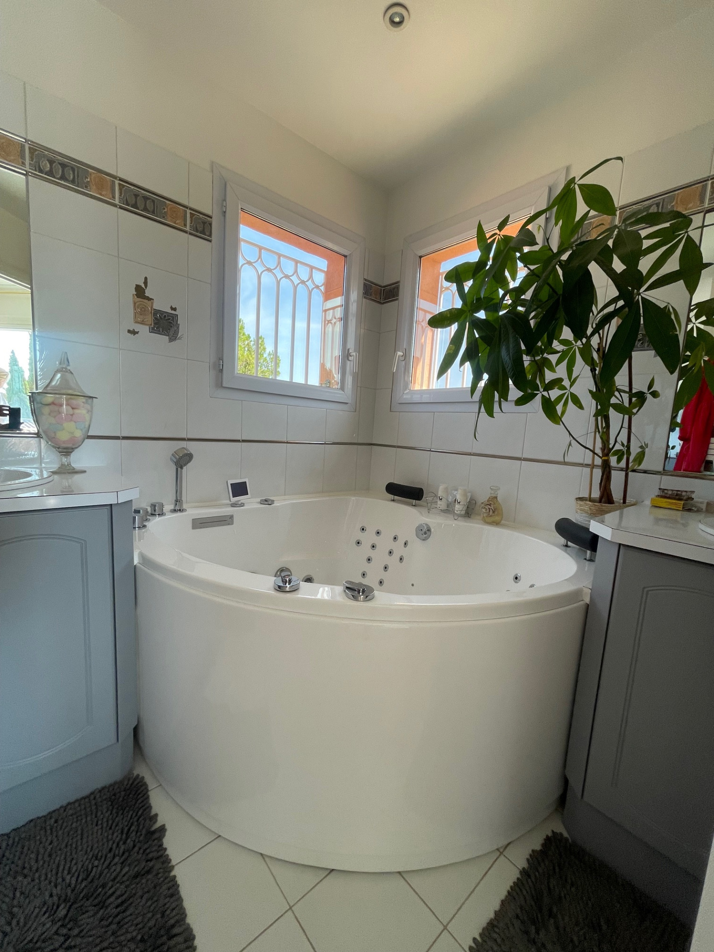 A l'étage Une suite parentale, avec salle de bains dont une baignoire balnéo et une douche à l'italienne donnant sur une terrasse qui vous offre une vue dégagée sur la propriété.