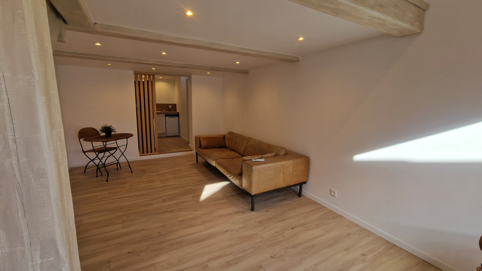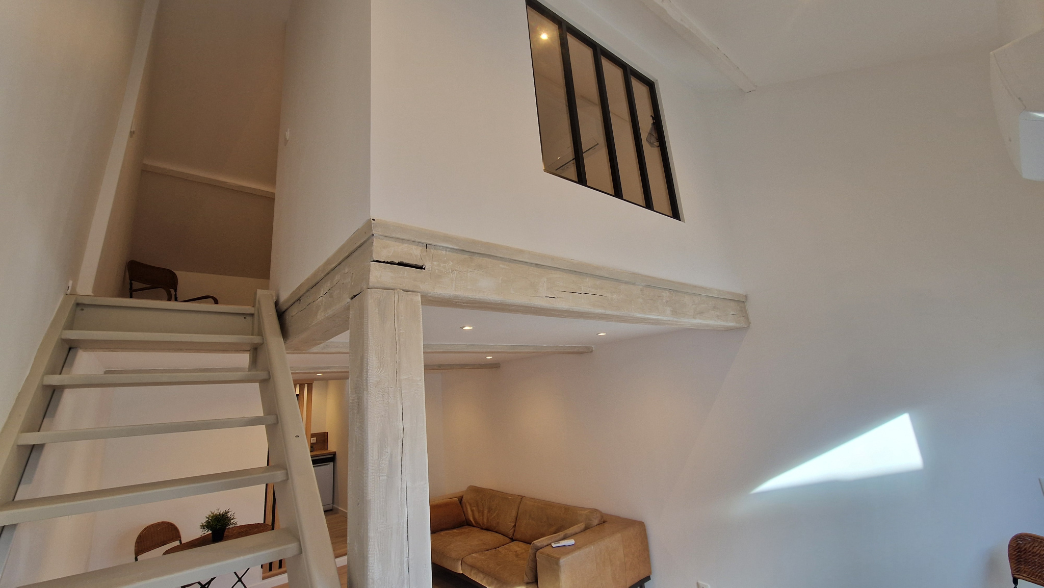 Il se compose d'une pièce de vie lumineuse, une cuisine séparée totalement équipée et aménagée (agrémentée d'un puits de lumière), d'une salle de douche avec wc et d'une chambre en mezzanine optimisant l'espace.