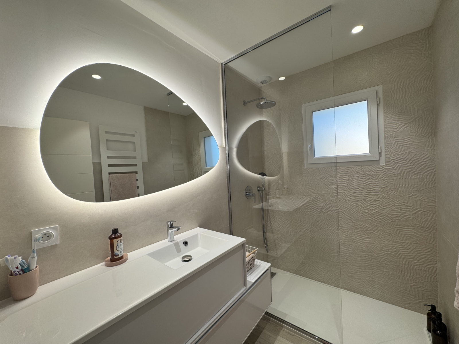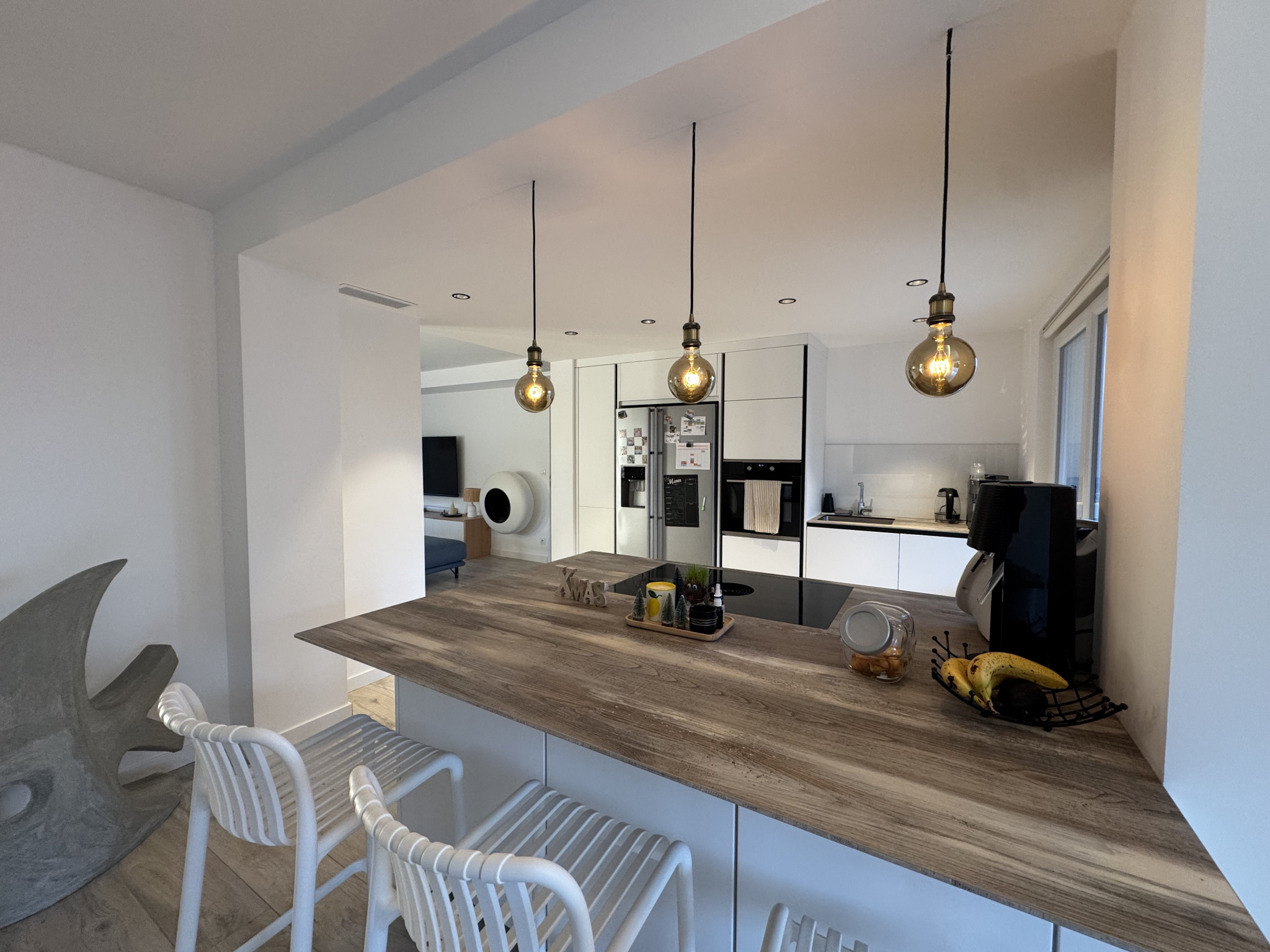 Au RDC une spacieuse pièce de vie de 70 m² avec une belle entrée, un salon cosi, une récente cuisine ouverte équipée aménagée et salle à manger, une grande suite avec espace chambre, dressing bureau salle de bains,buanderie, un WC indépendant.