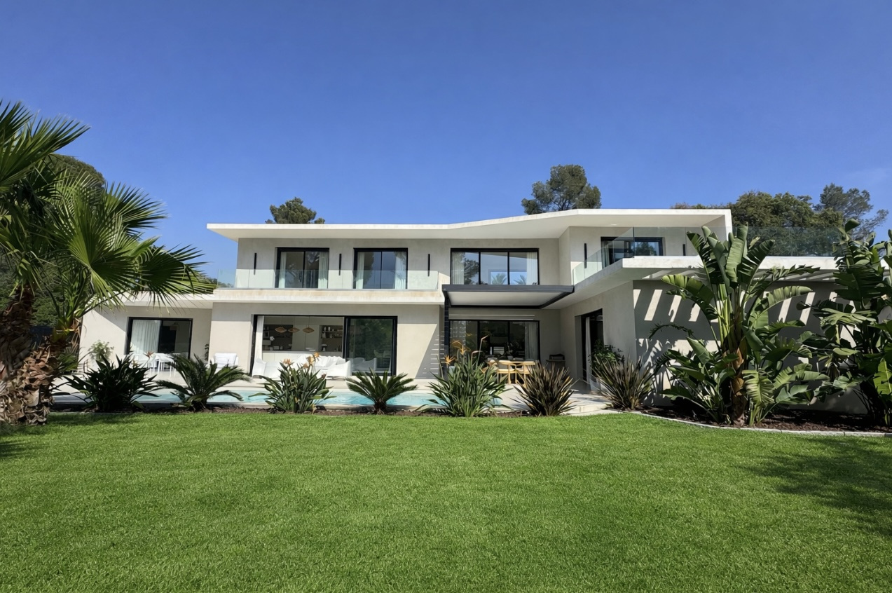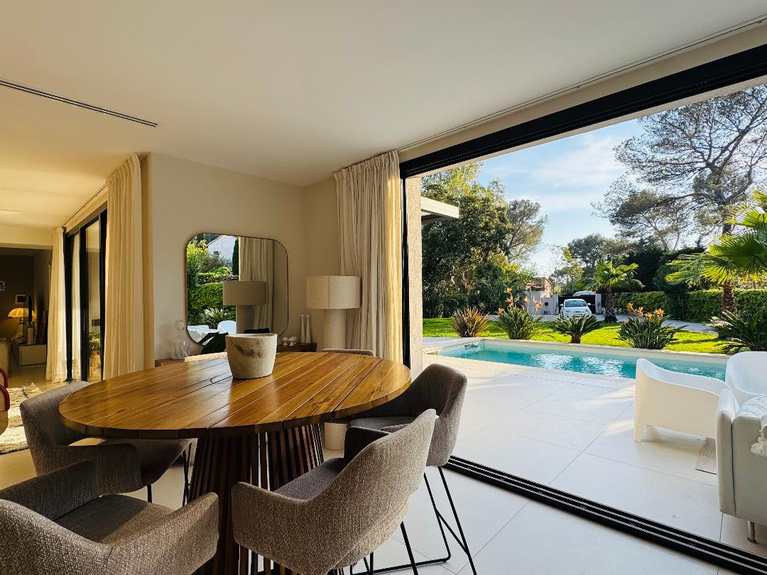 Située au coeur du quartier de Boulouris, en fond d'impasse et au calme absolu, cette villa contemporaine d'une surface de 230 m² a été construite en 2021 sur un superbe terrain paysagé de 1450 m².