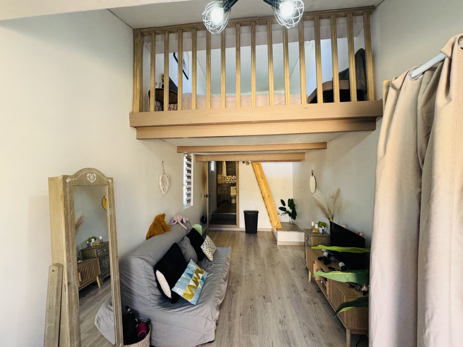 Au demi-niveau : une jolie chambre avec mezzanine, salle d'eau, WC et terrasse privée.